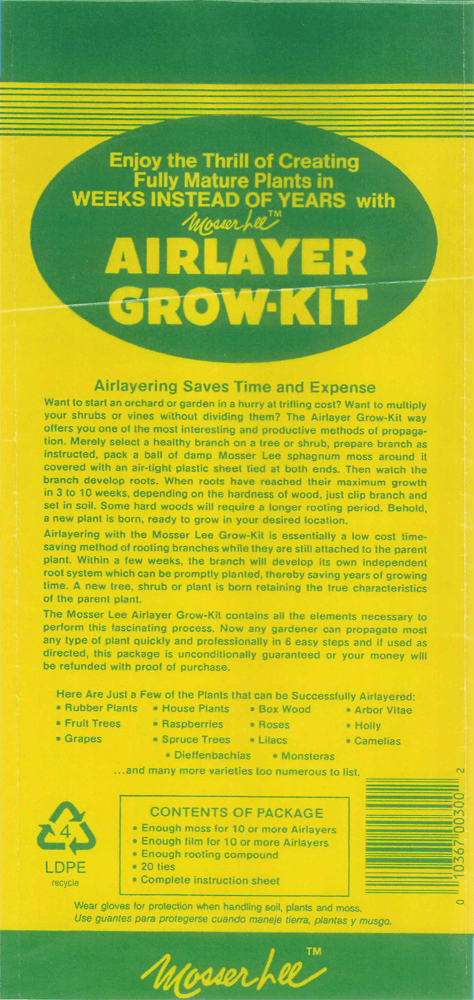 Mosser Lee’s Air layer Grow Kit contains everything needed to complete 10 air layers: long fiber Sphagnum Moss, plastic wraps, ties, rooting powder, picks and complete instructions.